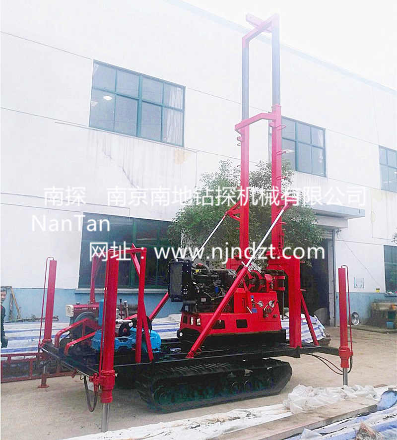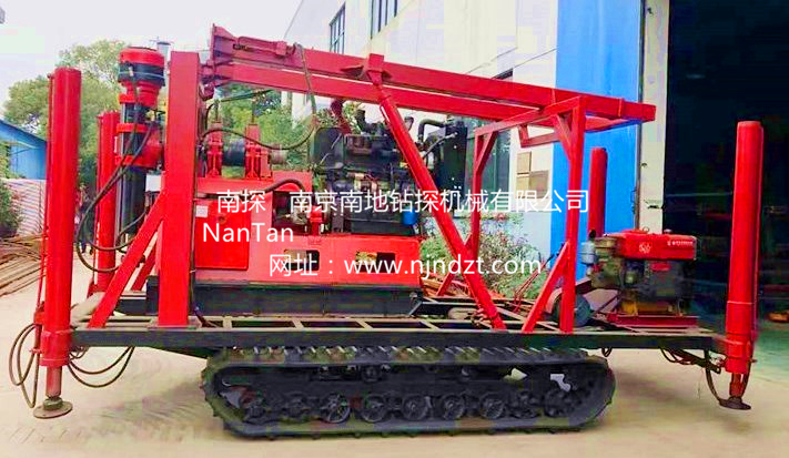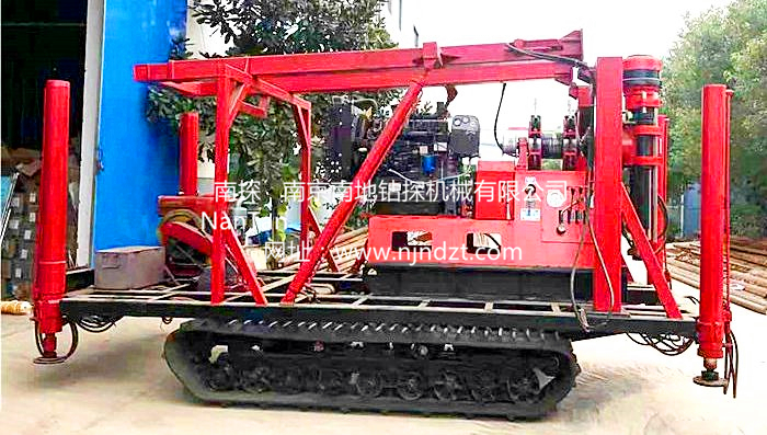 鉆機機組由履帶底盤、柴油機、升高型液壓支腿、鉆機、液壓起落鉆塔組成,共同組裝在一個機架上。鉆機可以選擇柴油機或電動機、履帶底盤及液壓支腿由獨立柴油機帶動、互不干涉。